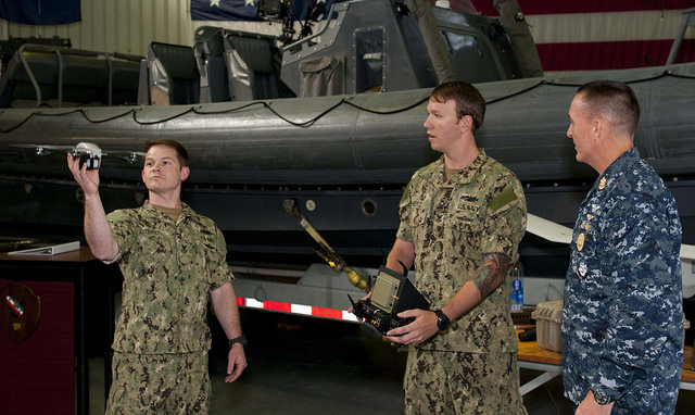 STUTTGART, Germany (Aug. 19, 2014) Master Chief Petty Officer of the Navy (MCPON) Mike Stevens is given a demonstration of an InstantEye Unmanned Aerial System during a visit to Naval Special Warfare Units 2 and 10. MCPON is in Northern Europe visiting Sailors as part of a fleet engagement to the area. (U.S. Navy photo by Mass Communication Specialist 2nd Class Martin L. Carey/Released)
